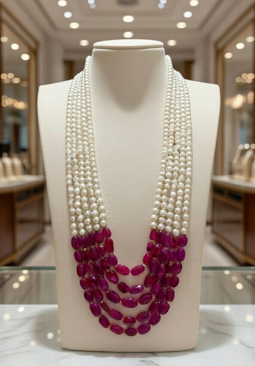 This necklace, multi-strand piece combining classic elegance with bold color contrast. It features several layered strands of lustrous white pearls at the top, cascading into richly hued maroon gemstone beads at the bottom. The transition from the soft sheen of pearls to the deep, faceted maroon stones creates a balanced blend of sophistication and drama. The layered construction adds volume and presence, making it a standout accessory rather than a subtle one.