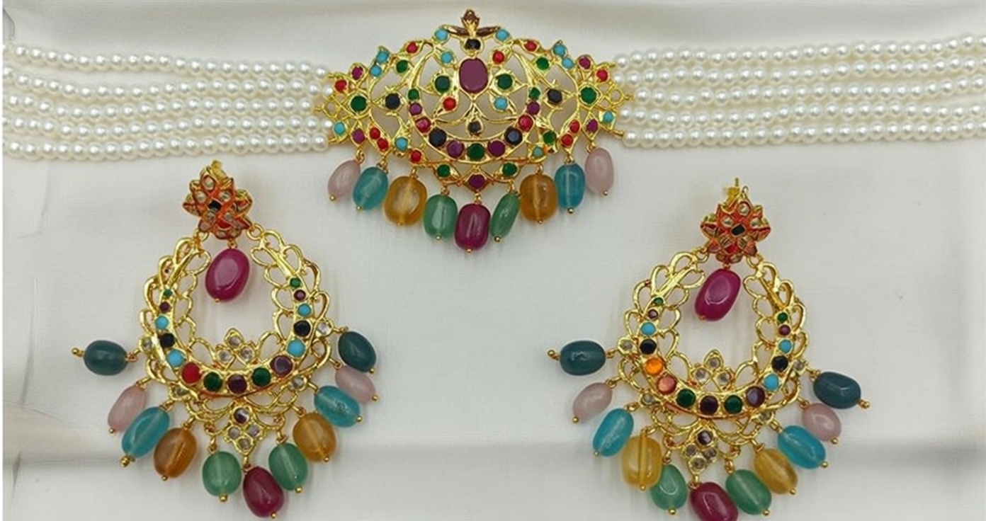 Pair with richly woven fabrics like Banarasi, Kanjeevaram, or raw silk in deep, solid tones such as emerald green, royal blue, magenta, or mustard to highlight the multicolored gemstones. - Necklines: