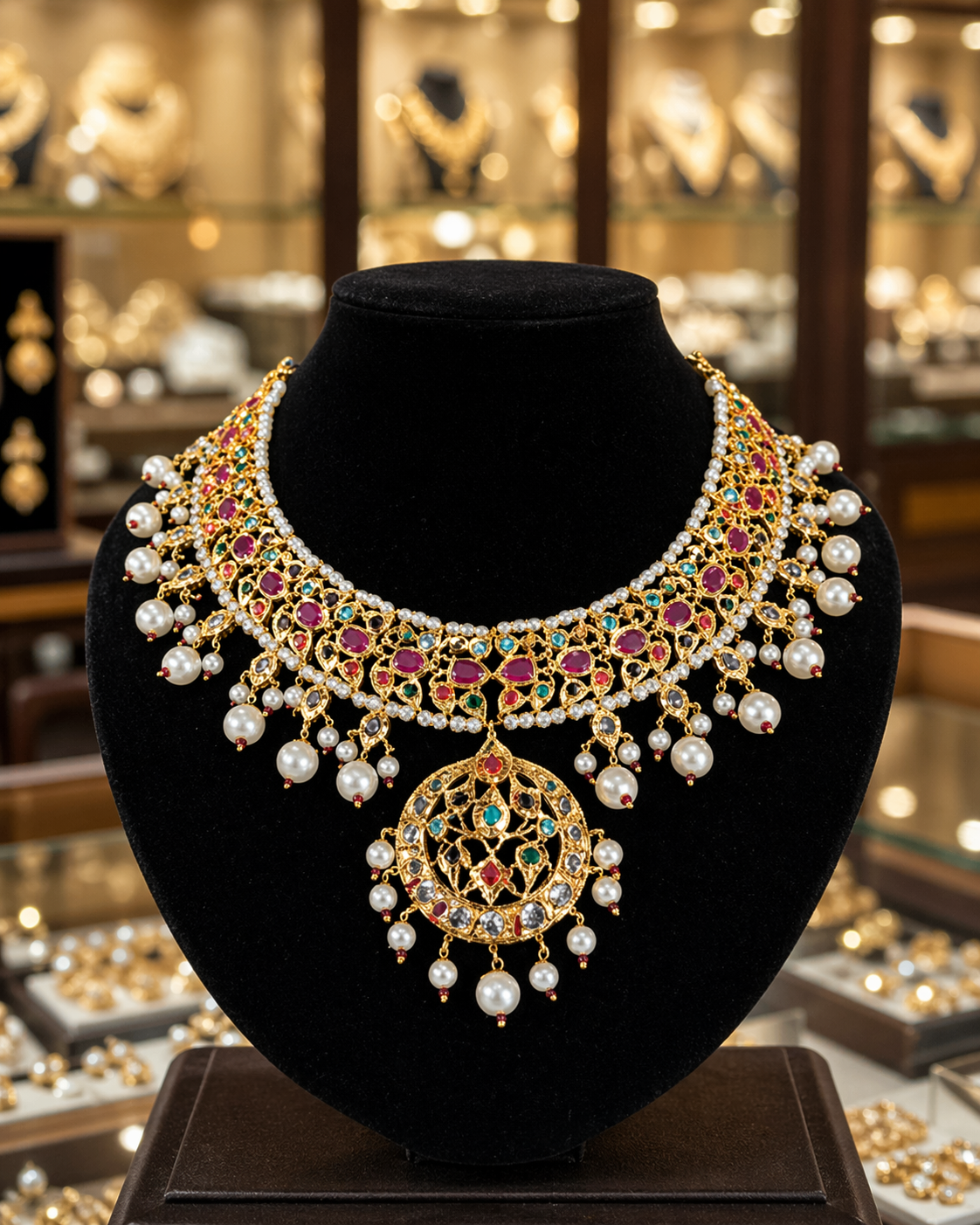 This is a magnificent and opulent jewelry set that radiates royal heritage and rich tradition. The set features a grand, multi-layered necklace crafted from a polished gold base, adorned with vibrant red and blue gemstones interspersed with lustrous pearls. The centerpiece is a large, intricate pendant that commands attention, creating a look that is both majestic and undeniably luxurious.