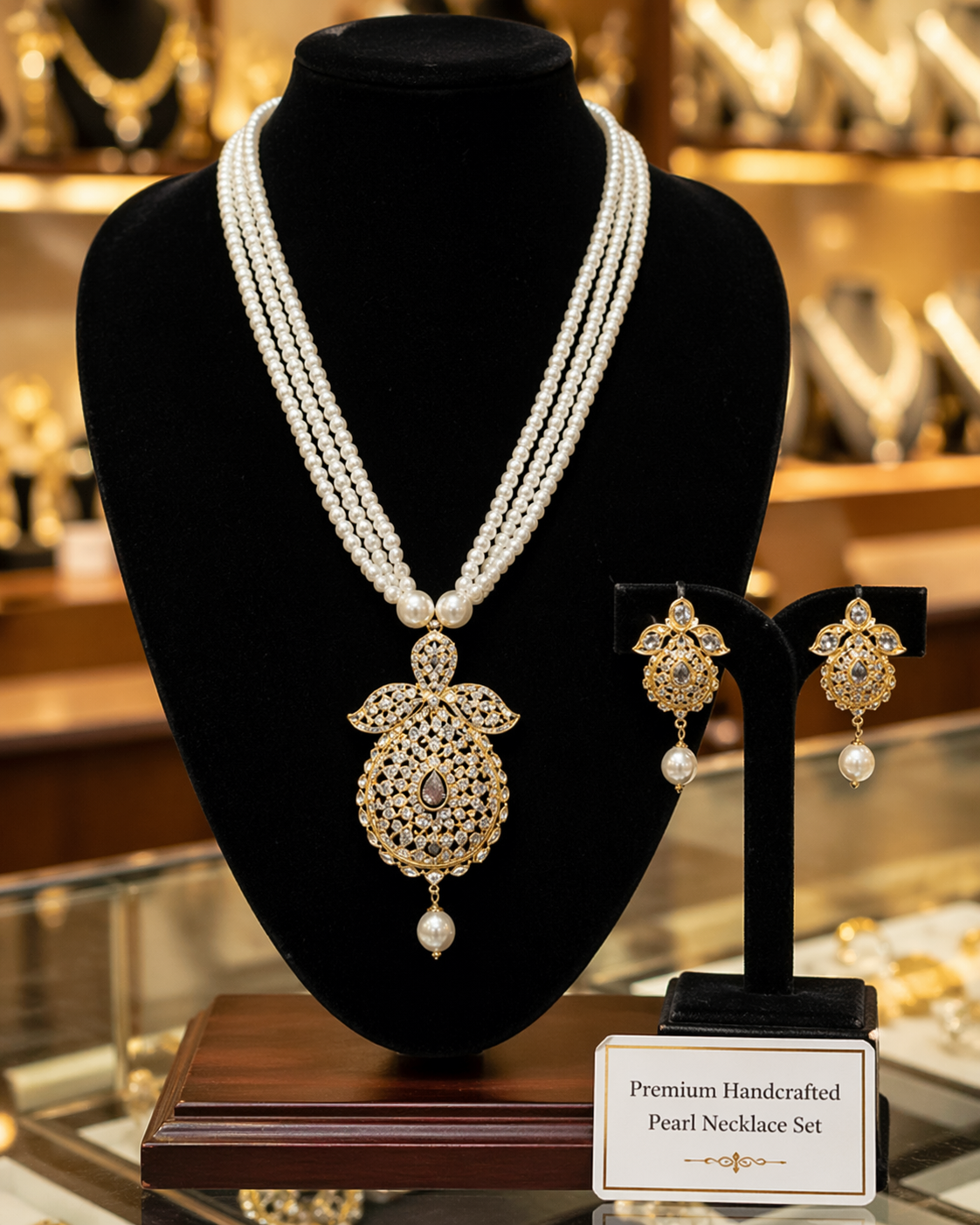 This is a luxurious and sophisticated jewelry set that combines classic purity with intricate craftsmanship. The set features a sumptuous multi-strand pearl necklace anchored by a magnificent, ornate gold pendant, accompanied by a pair of matching gold and pearl earrings. Displayed against a stark black background, the contrast highlights the creamy luster of the pearls […]