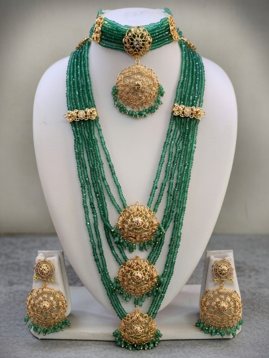 - Necklace: A layered arrangement of vibrant green bead strands, punctuated with intricately crafted gold medallions that lend structure and a sense of heritage artistry.