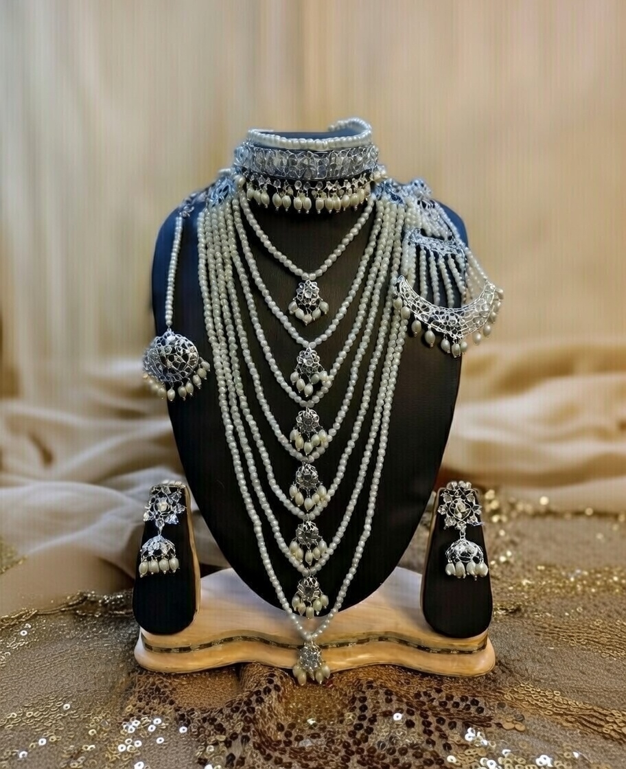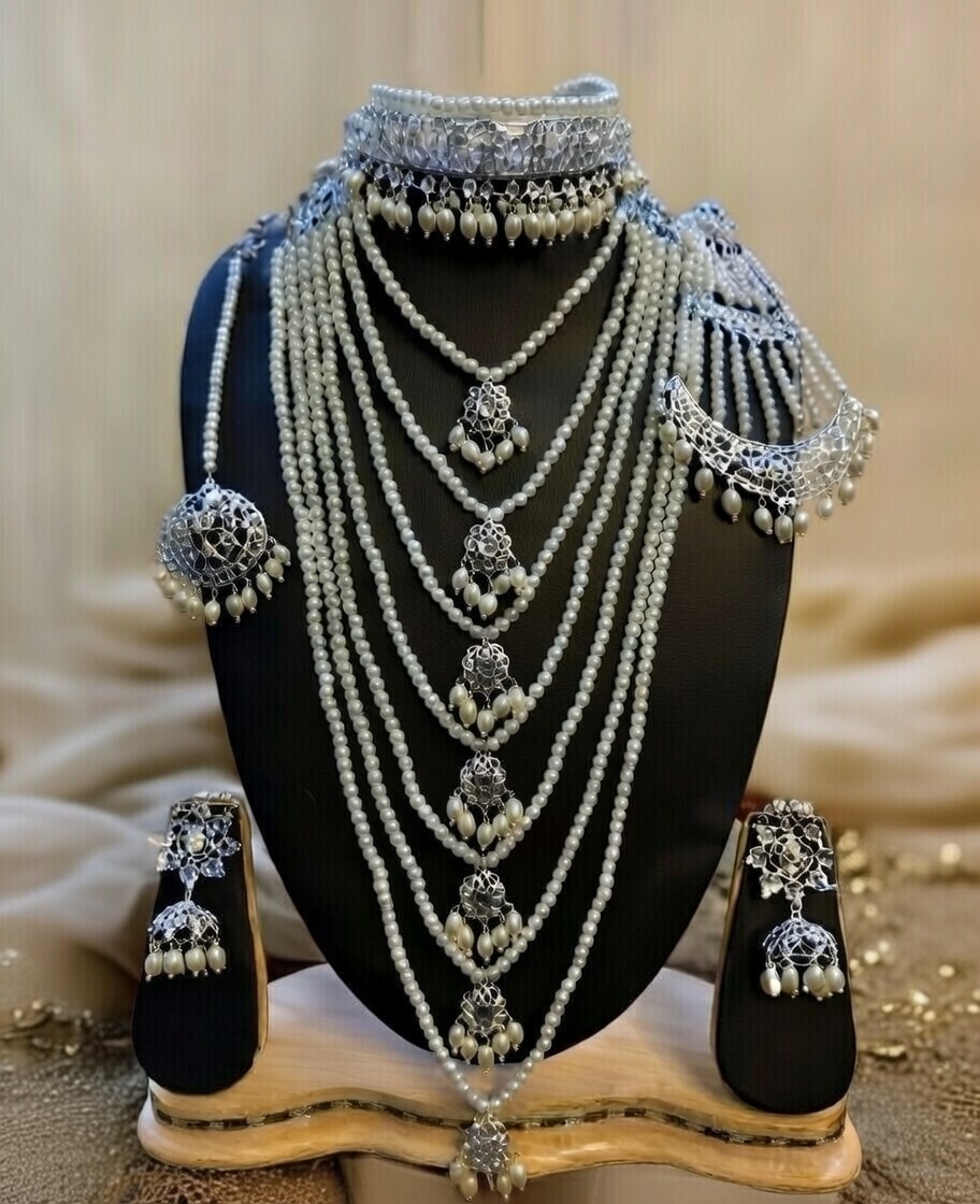 - Necklace Duo: A layered composition featuring an ornate silver filigree choker paired with a seven-strand pearl Satlada. The strands are accented with delicate, snowflake-inspired silver motifs and pearl clusters.