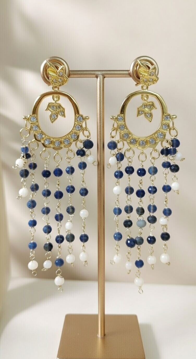 This is a pair of breathtaking chandelier earrings that beautifully combine intricate craftsmanship with fluid, eye-catching movement. Designed with a gold-tone openwork frame featuring delicate leaf motifs and shimmering stone accents, the earrings are finished with cascading tassels of blue and white beads. The layered beadwork creates a graceful waterfall effect, adding both texture and elegance to the overall design.