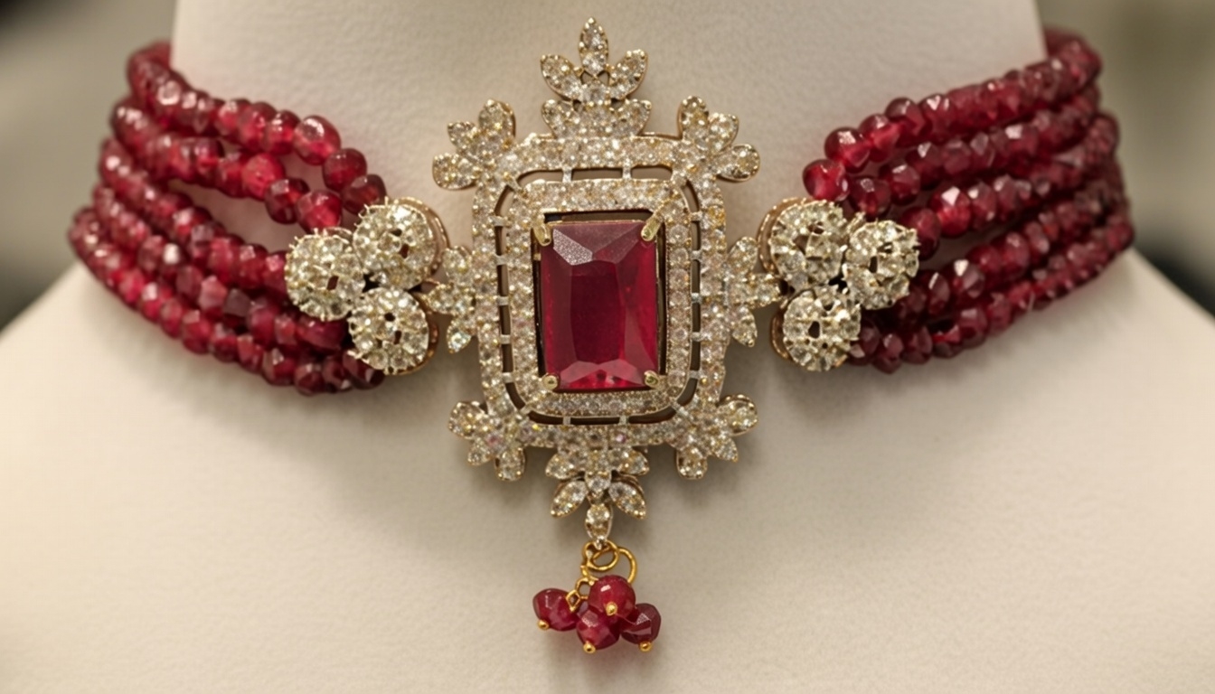 Overall, this red onyx and diamond choker is a masterclass in bold elegance—offering a powerful, statement-making aesthetic that effortlessly bridges traditional gemstone richness with modern luxury styling.