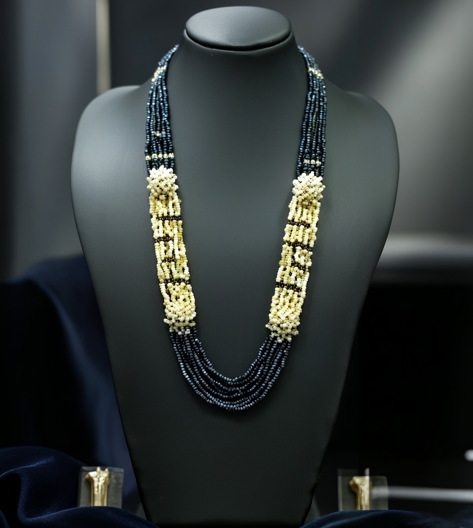 This is a breathtakingly luxurious, seven-layer necklace that radiates a refined, monochromatic opulence. Elegantly designed with a balance of modern structure and traditional richness, the piece features alternating strands of dark and light beads that create a rhythmic, striped effect across the neckline. The design is elevated by two prominent clusters of densely arranged light beads at the center, acting as luminous focal points that add depth and architectural intrigue. The layered volume and high-contrast palette give the necklace a commanding yet sophisticated presence.
