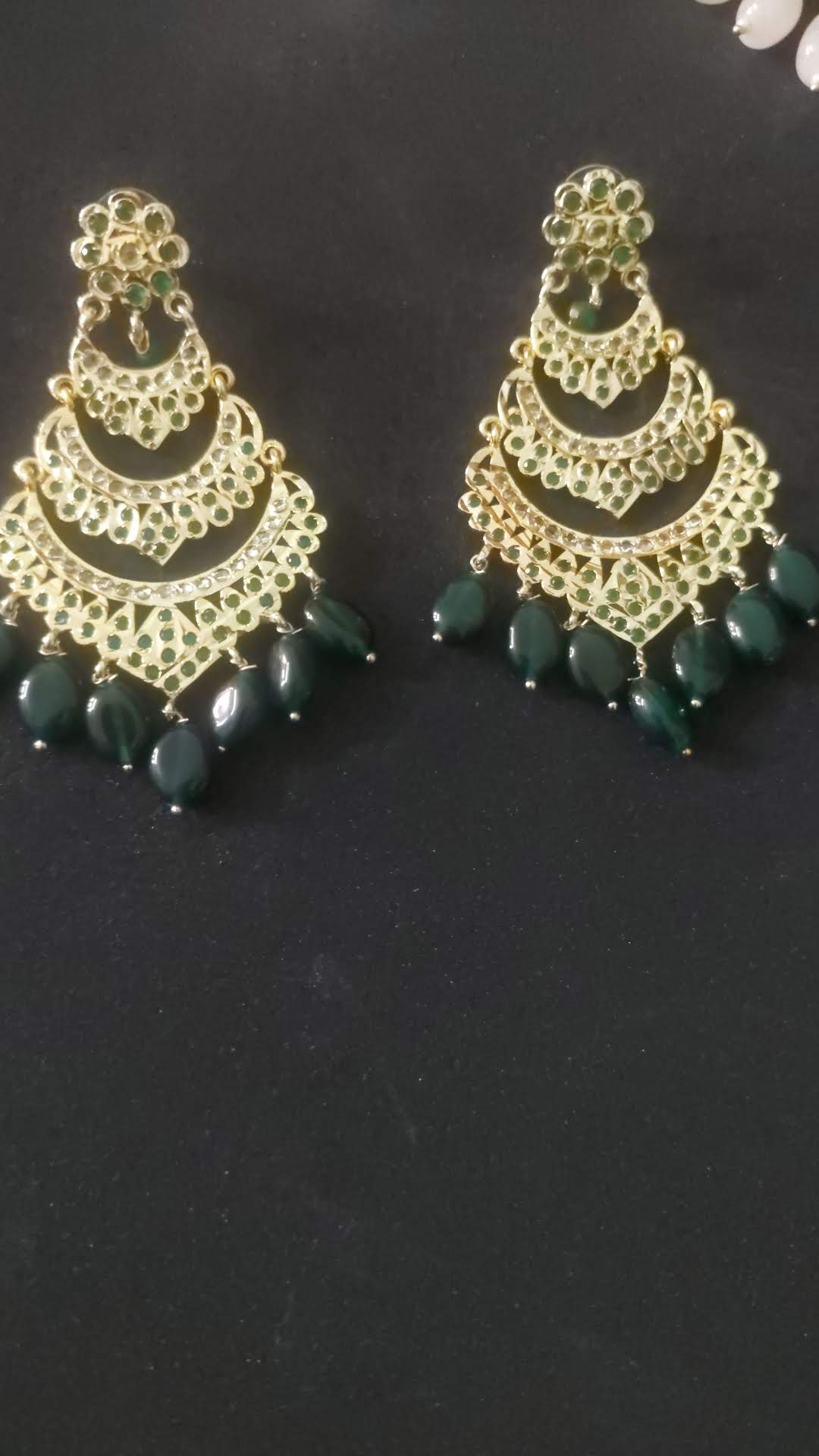 Crafted with a gold-tone metal base, embellished with kundan-style stones and glossy green beads. The warm gold finish paired with deep green tones gives the earrings a luxurious, traditional appeal.