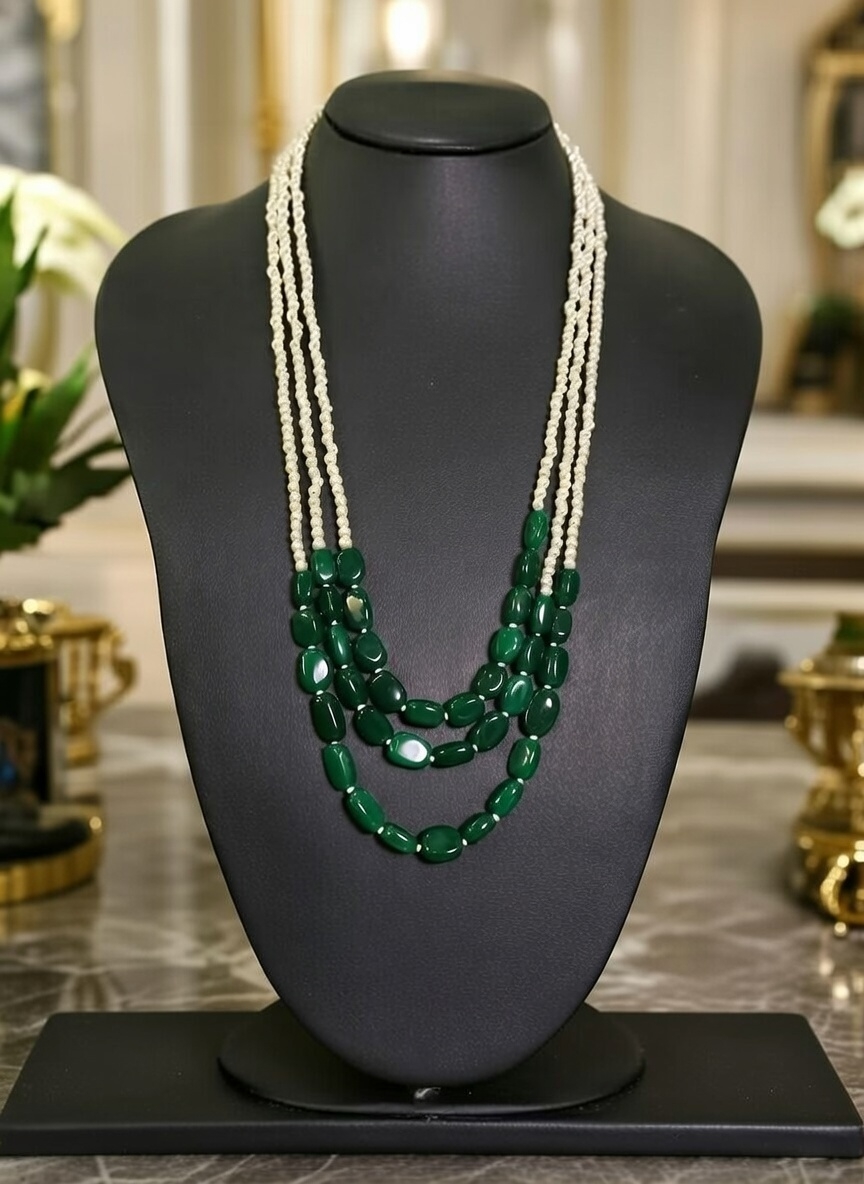 • Necklace: A dual-strand arrangement of polished red and green beads, forming a colorful and dynamic base that instantly draws attention.
