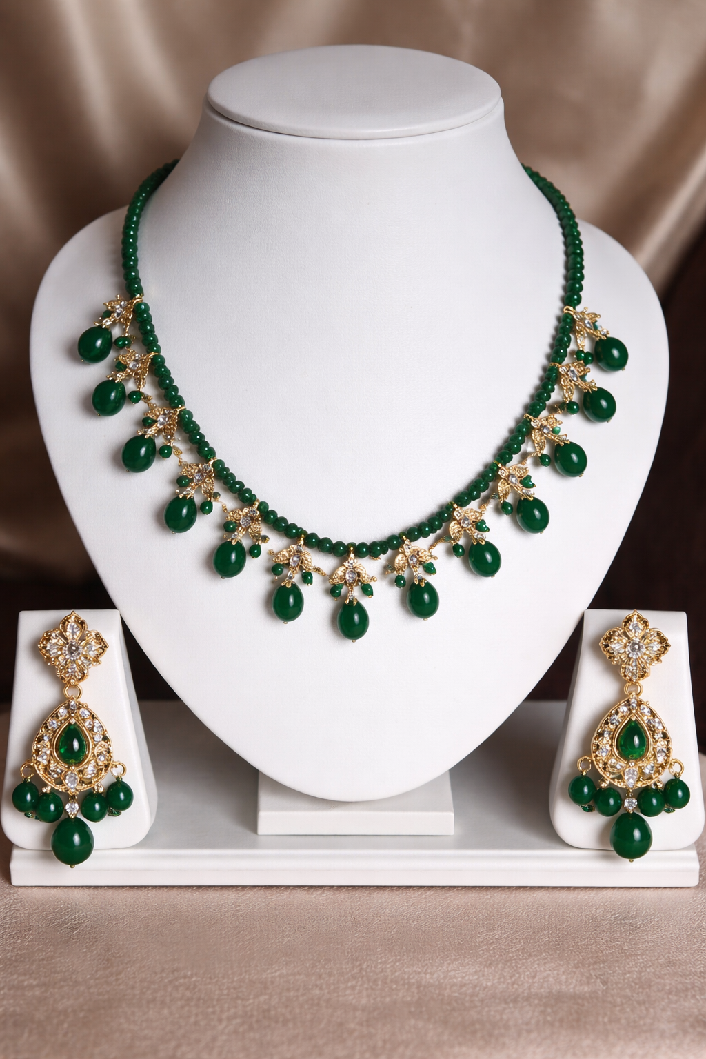 • Opt for makeup with earthy tones, gold eyeshadow, and a subtle glossy lip to keep the focus on the vibrant green of the jewelry.