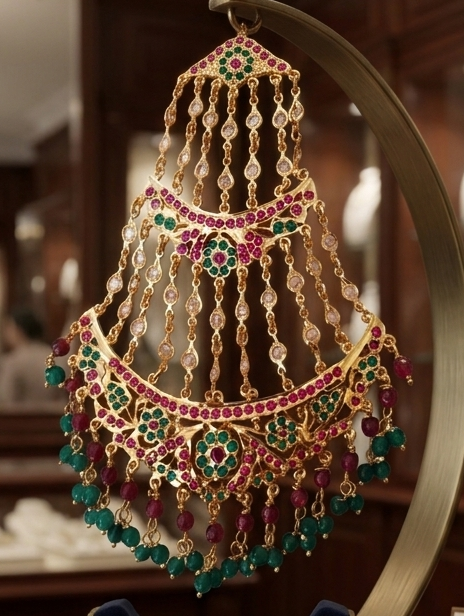 This is a regal and intricately crafted jewelry piece that embodies the elegance of traditional bridal adornment and the brilliance of fine artistry. This piece, known as a Jhumar, is traditionally worn by brides and holds deep cultural significance. Suspended on a refined display stand within a luxurious boutique setting, it features cascading layers of gold chains, sparkling stones, and vibrant bead accents—creating a visual that is both majestic and exquisitely detailed.