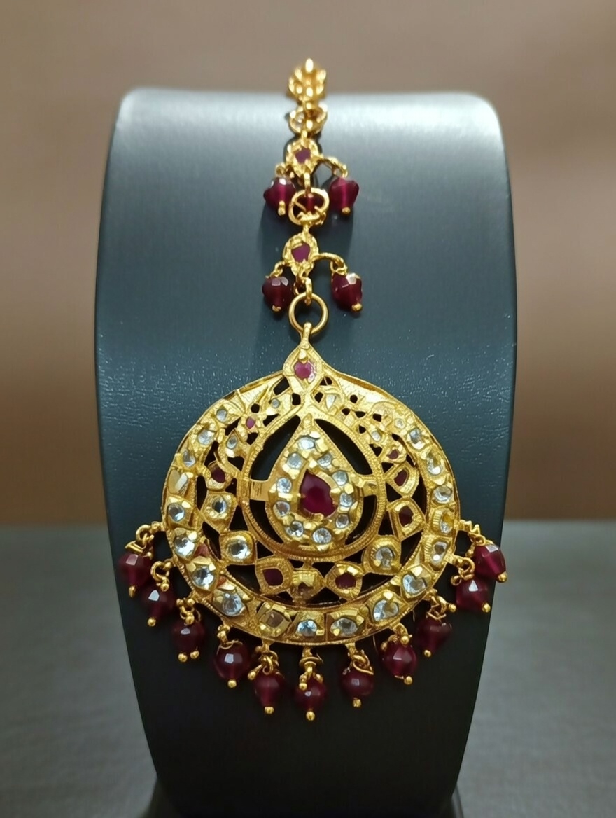 Overall, this ruby Kundan Chandbali maang tikka is a timeless expression of heritage craftsmanship—perfect for those seeking a piece that embodies tradition, elegance, and ceremonial significance.