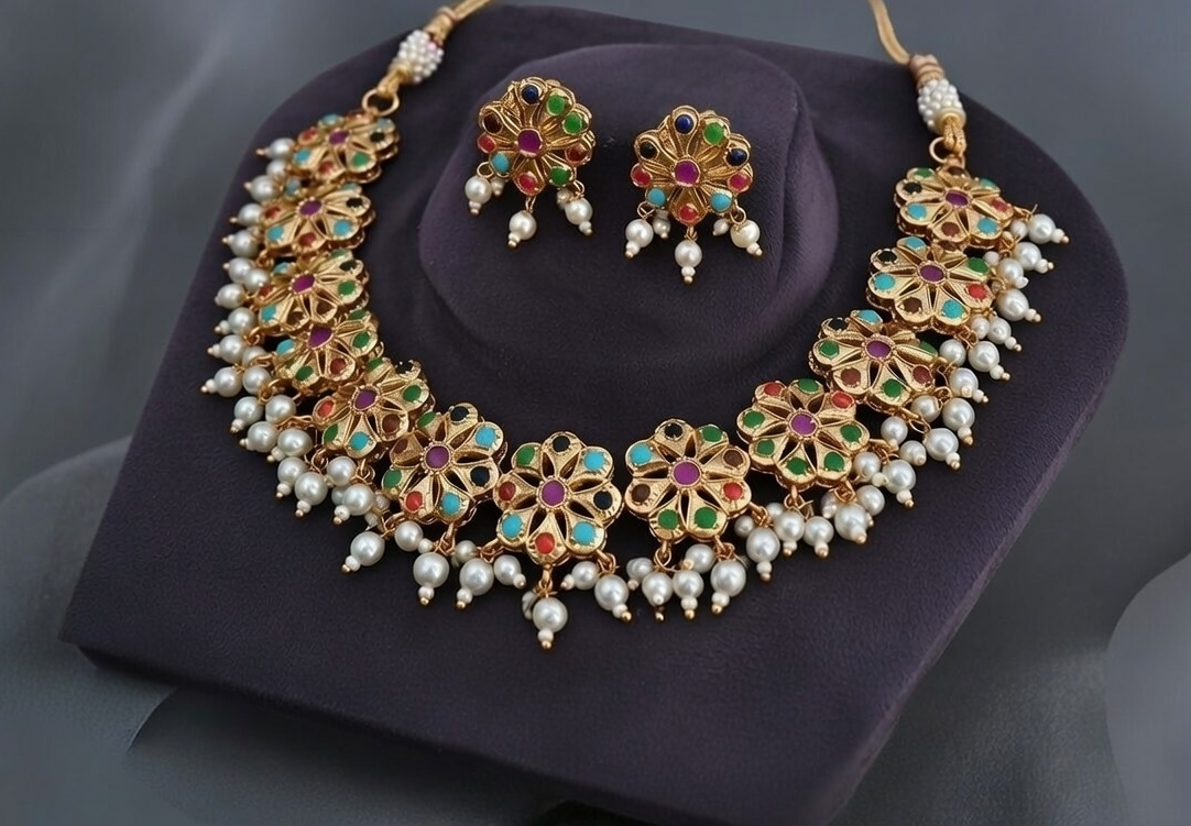 • Earrings: Coordinated floral studs with matching colored stones and pearl danglers, designed to echo the necklace’s pattern while offering a balanced, lightweight complement.