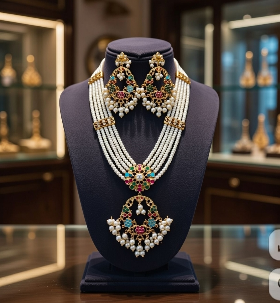 - Necklace: A layered arrangement of fine white pearl strands, structured with gold spacers and centered around a floral Kundan motif. The necklace culminates in an elaborate pendant featuring multi-colored stones and delicate pearl clusters, adding movement and richness.