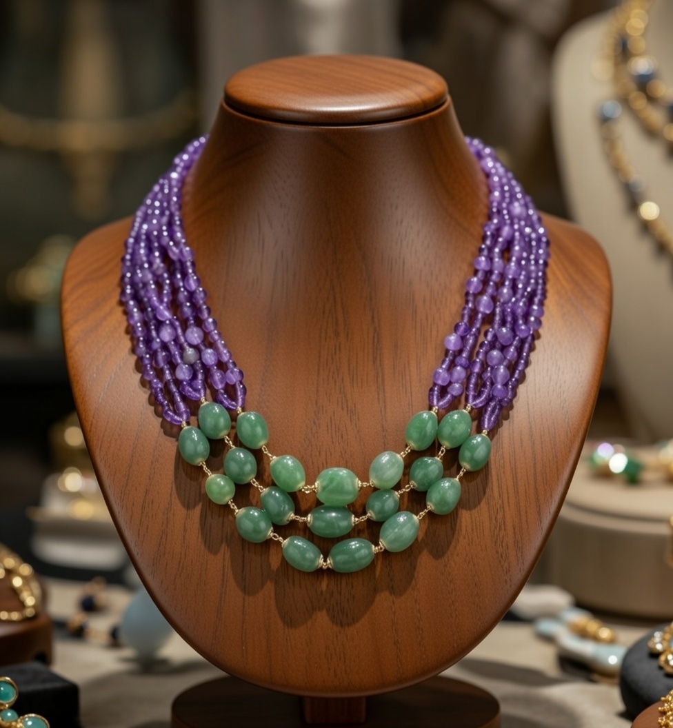 A sophisticated fusion of cool and earthy tones. The soft, amethyst-like purple contrasts beautifully with the deep, vibrant green of the lower beads, resulting in a dynamic yet harmonious color story that feels both organic and fashion-forward.