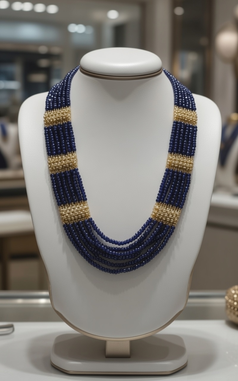 This is a breathtakingly luxurious, multi-layered necklace that radiates deep, celestial opulence. Elegantly designed with a refined contrast, the piece features strands of lustrous deep blue beads interwoven with radiant gold accents. The interplay of cool, насыщенный blue tones and warm, shimmering gold creates a majestic visual rhythm. With its dense layering and high-gloss finish, the necklace commands attention—evoking the richness of midnight skies and royal treasures while maintaining a contemporary, polished appeal.