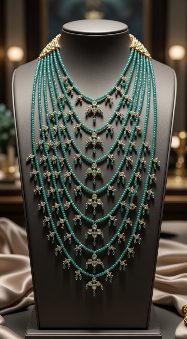 - Necklace: Seven cascading strands of polished teal onyx beads, each layer adorned with delicate gold-tone charms and teal drops that create a subtle, shimmering motion.