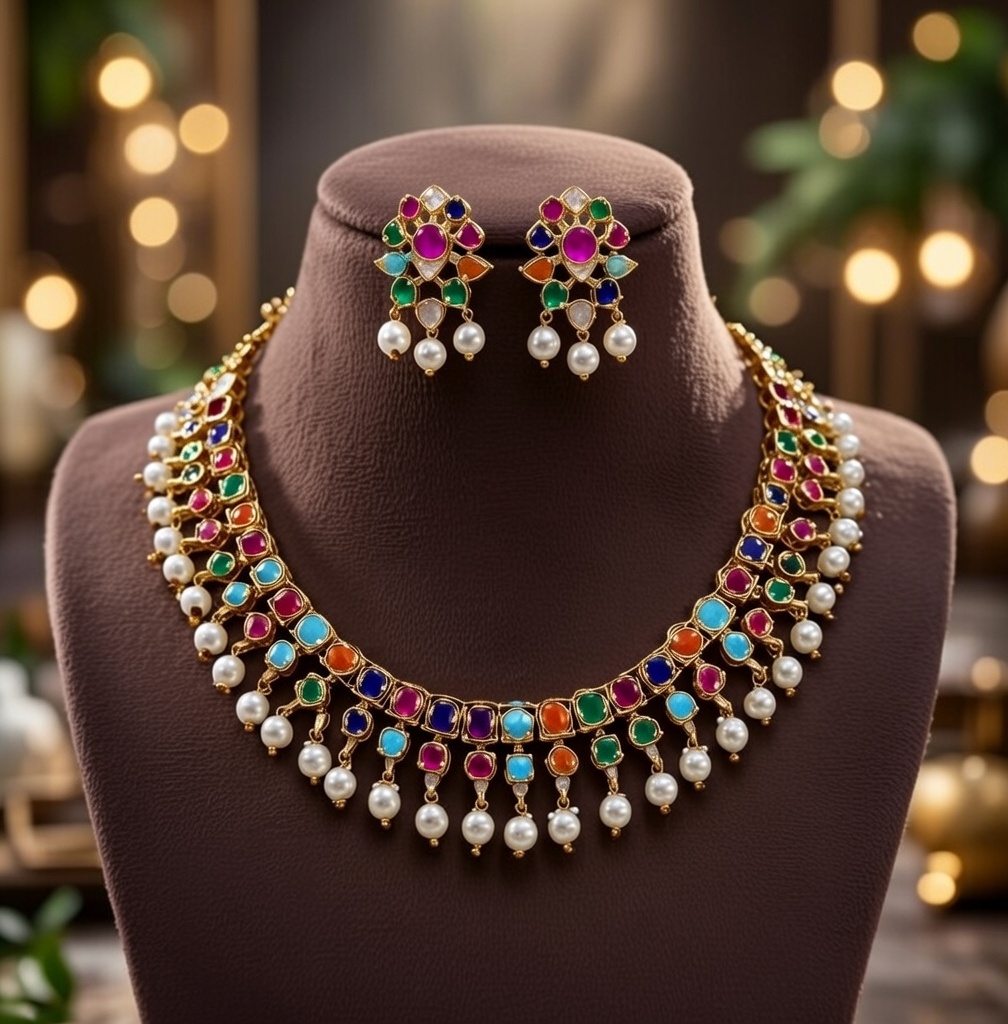 This is a vibrant and eye-catching necklace set that beautifully blends traditional craftsmanship with a playful spectrum of colors. The design features a sleek gold-tone base adorned with an array of multi-colored Kundan-style stones, finished with delicate pearl drops that add softness and movement. Paired with matching earrings, the set creates a lively yet elegant look that is perfect for festive and celebratory wear.