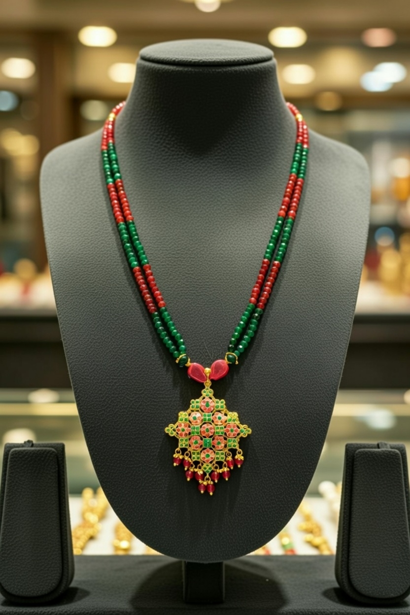 This is a lively and traditional two-layer necklace that beautifully combines red and green beads with an ornate gold pendant at its center. The interplay of vibrant beadwork and detailed gold craftsmanship creates a design that feels both festive and elegant. Set against a dark backdrop, the rich hues and metallic accents stand out vividly, emphasizing the necklace’s celebratory charm and artisanal detail.