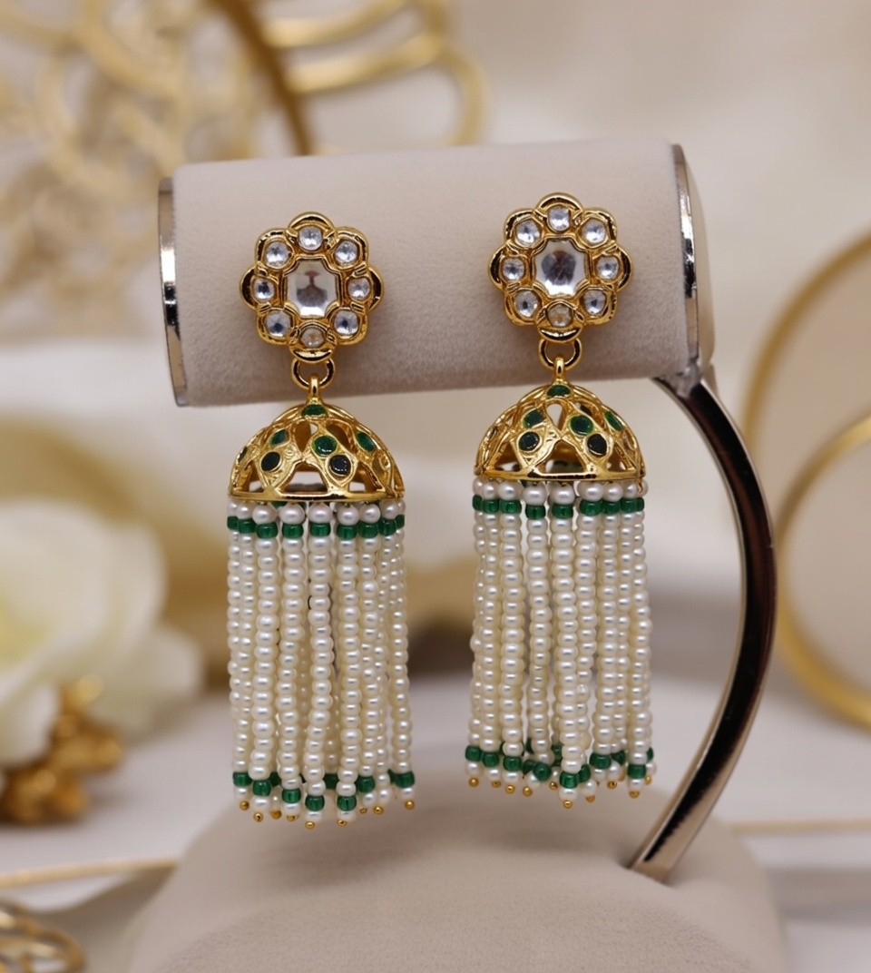 A classic Jhumka-style design featuring a floral stud at the top, embellished with clear stones arranged in a symmetrical pattern. This leads into a dome-shaped (ghungroo-inspired) structure with delicate openwork, accented by green stones. The design is completed with long, cascading strands of fine pearls that create elegant movement.