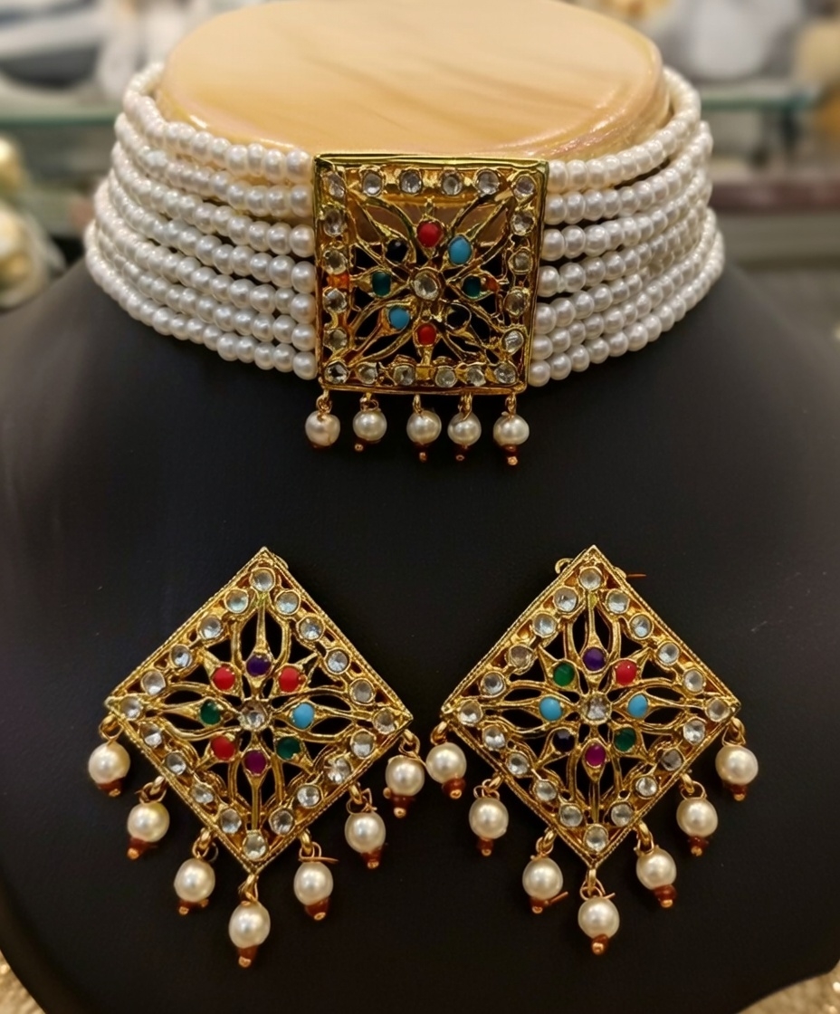 This is an exquisitely crafted Jadau-style choker jewelry set that radiates royal grandeur through a masterful fusion of traditional Indian craftsmanship and luxurious materials. Designed in a rich antique gold finish, the piece features multiple strands of lustrous white pearls forming a regal base, elevated by ornate gold settings adorned with a vibrant array of colorful gemstones. The set is perfectly complemented by matching geometric statement earrings that echo the central motif, finished with elegant pearl drops for added sophistication.